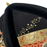It features black wool felt, traditional Japanese patterns decorated with hand-painted gold leaf, gold studs, a wide ribbon, and hand-sewn stitching that faithfully reproduces the way the traditional black-tomesode was made.