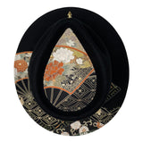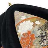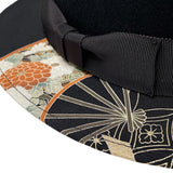 ブラックウールフェルトに、繊細な金彩が施された扇子など古典柄、スダッズ、幅広のリボン、また伝統的な黒留袖のつくり方を忠実に再現した手縫いのステッチが特徴です。