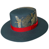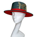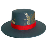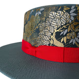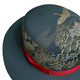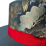 クラウンは伝統柄の地紋 (織模様) に金箔で手描きされた日本画が上品に煌めいて、裏ブリムは羽ばたく鶴のダイナミックな地紋に金箔が散りばめられています。