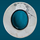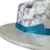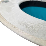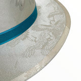 優美な墨絵牡丹、見る角度により浮かびあがる織り鶴模様 (地紋)、ターコイズブルーのシルクバンドが特徴です。